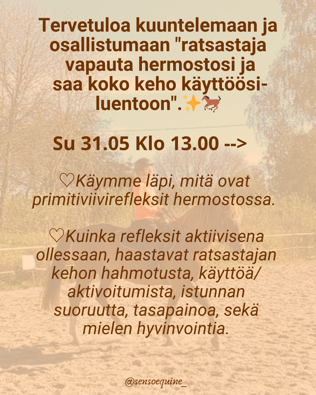 SensoEquinen Saara tulee pitämään luennon Imatran Ratsastajat ry:n jäsenille primitiivireflekseistä ja niiden vaikutuksesta ratsastukseen. Luennossa käydään yhdessä läpi: - Mitä primitiivirefleksit…