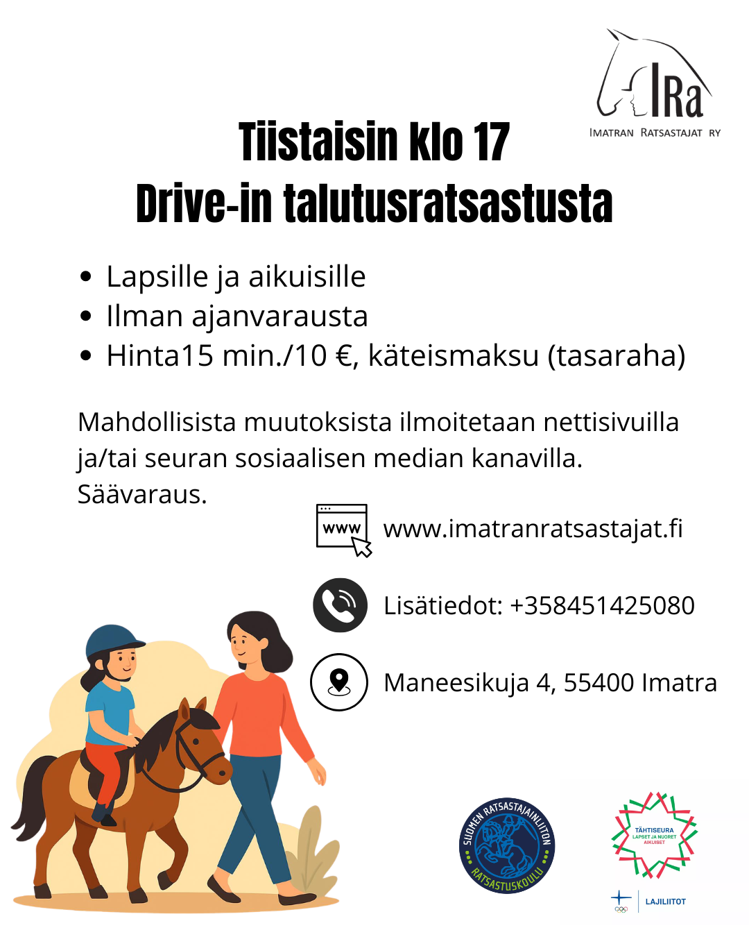 Imatran Ratsastajat ry:n talli on Suomen Ratsastajainliiton (SRL) hyväksymä ratsastuskoulu.